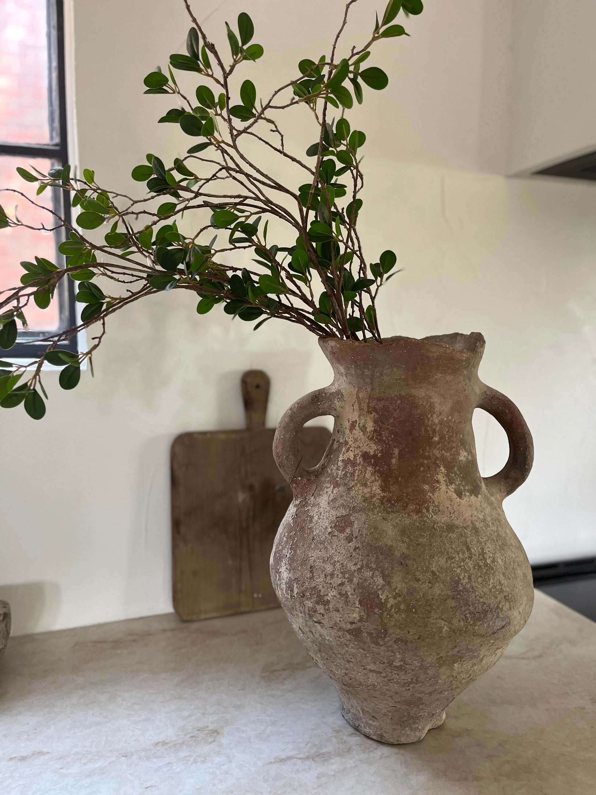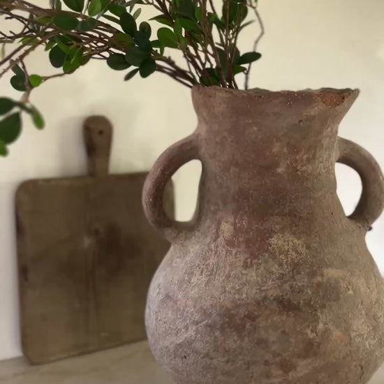 This vessel is nearly 2 centuries old. You can tell her age by some of her imperfections, but imperfection is beauty in our world. Her shape, coloring and 2 handles are stunning. Once used for olive oil storage, these true antique vessels bring an old world feel to your space. We have a similar vessel in our own home.